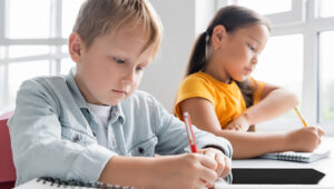 Multicultural schoolchildren engaged in learning in a bright, modern classroom