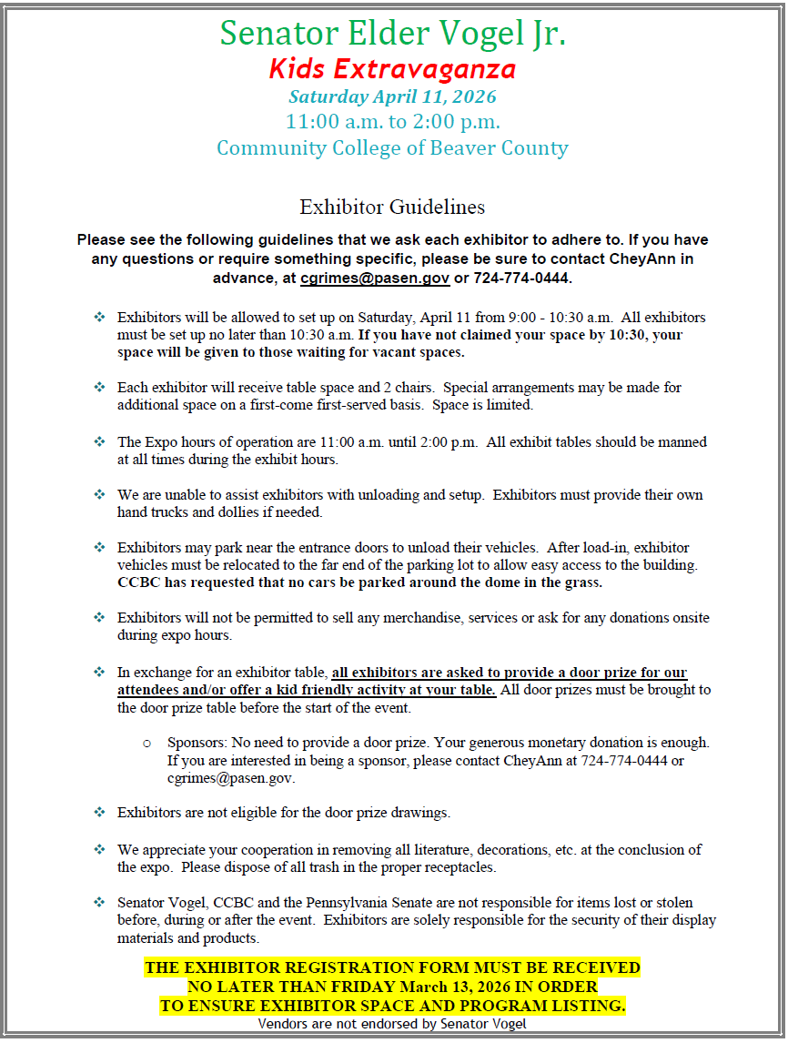 Senator Vogel’s Kids Extravaganza Guidelines and Registration Form View/print here. Registration Form Senator Vogel's Kids Extravaganza NameThis field is for validation purposes and should be left unchanged.My organization is a government entity or a not-for-profit:(Required) Yes No If you selected no above, please select level of sponsorship below. Premier Sponsor ($1000+) Level 1 ($500) Level 2 ($250-499) Level 3 ($100-249) Contact Name:(Required)Contact Phone(Required)Email:(Required) Enter Email Confirm Email Organization Name: (For Program)(Required)Organization Mailing Address: (For Program)(Required) Street Address Address Line 2 City AlabamaAlaskaAmerican SamoaArizonaArkansasCaliforniaColoradoConnecticutDelawareDistrict of ColumbiaFloridaGeorgiaGuamHawaiiIdahoIllinoisIndianaIowaKansasKentuckyLouisianaMaineMarylandMassachusettsMichiganMinnesotaMississippiMissouriMontanaNebraskaNevadaNew HampshireNew JerseyNew MexicoNew YorkNorth CarolinaNorth DakotaNorthern Mariana IslandsOhioOklahomaOregonPennsylvaniaPuerto RicoRhode IslandSouth CarolinaSouth DakotaTennesseeTexasUtahU.S. Virgin IslandsVermontVirginiaWashingtonWest VirginiaWisconsinWyomingArmed Forces AmericasArmed Forces EuropeArmed Forces Pacific State ZIP Code Organization Phone: (For Program)(Required)Organization Website (For Program) There will be 1 table and 2 chairs available for each exhibitor.Does your exhibit require an electrical outlet?(Required) Yes No Does your exhibit require OUTDOOR space?(Required) Yes No Do you have a special request?